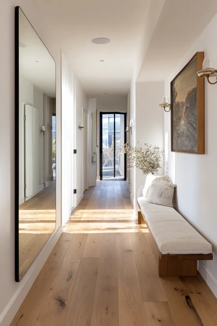 - Längsseiten nutzen: Ein großer Spiegel an einer der langen Wände lässt den Flur breiter erscheinen.