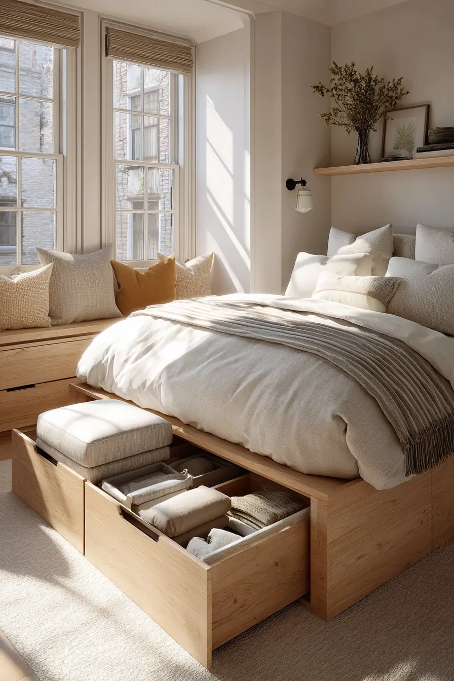 - Betttruhen am Fußende: Eine schmale Truhe bietet Platz für Tagesdecken und dient gleichzeitig als Sitzgelegenheit beim Anziehen.